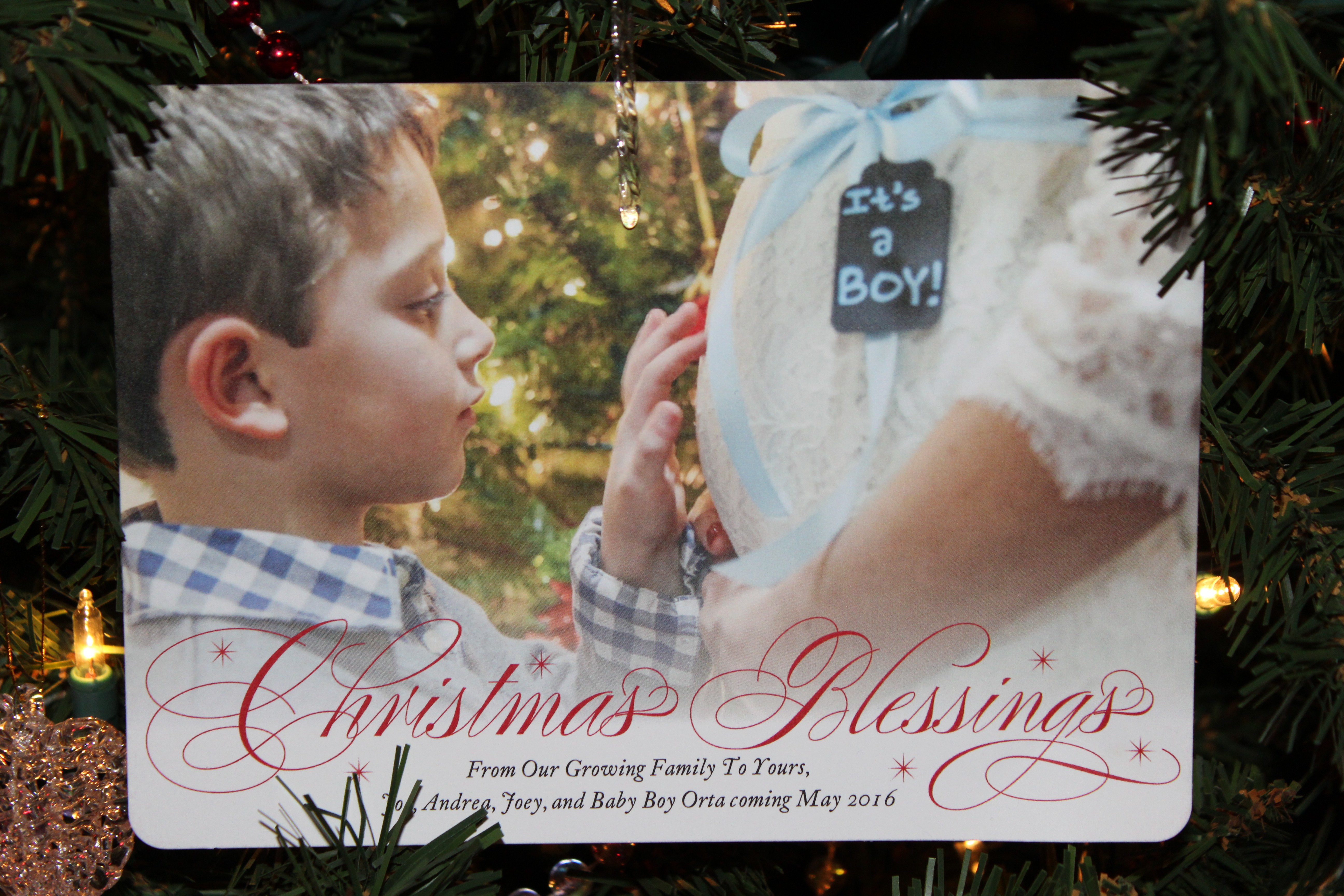 Since the part of the "background" that's in front of the Christmas card and the part that's behind it appear equally sharp, I think we can rule out front- or back-focusing. The source of the illusion may be that the picture on the Christmas card itself isn't terribly sharp. (Its own background certainly isn't, but that was probably intentional.) The bottom line is that if there's any confusion between what's background and what's foreground, your eye will probably interpret the sharpest part of the image as foreground. My guess is that if you were to simply pick up one of the Christmas cards and look at it, it would appear perfectly fine.